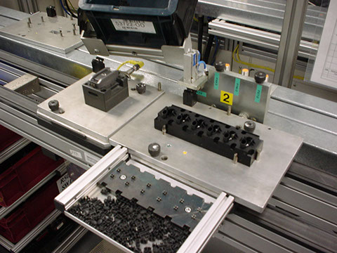 Actuators are to be loaded into the nest area of the work holder, as this section is depressed a sliding gate moves slightly allowing the actuators to drop into the respective apertures of the switch panel.