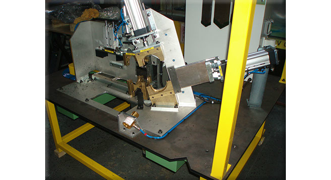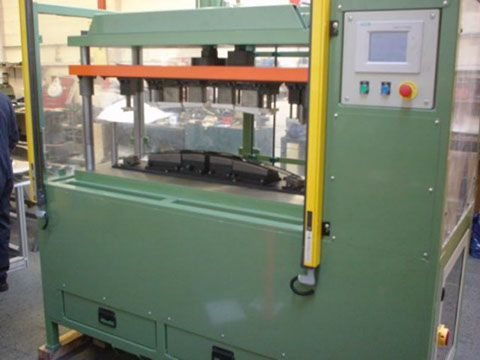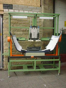 Machine that assist in the assembly of the two mouldings that makes a rear spoiler.