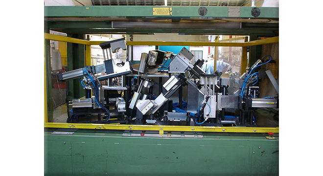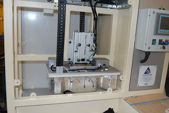 This is a two station tool to produce 3 knife cuts & remove 2 “chimney” ducts from the component. Station 1 leak test the part & then remove the chimneys ducts using saw blades & the blowpin end of the part with a knife blade. Station 2 vacuum out the swarf left by the sawing operation & then split the component using 2 knife cuts.