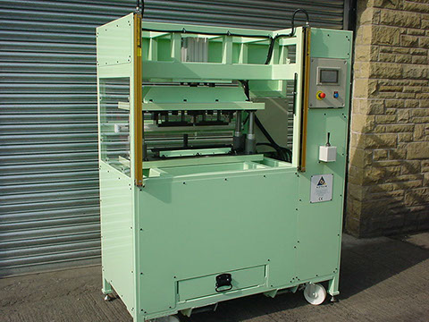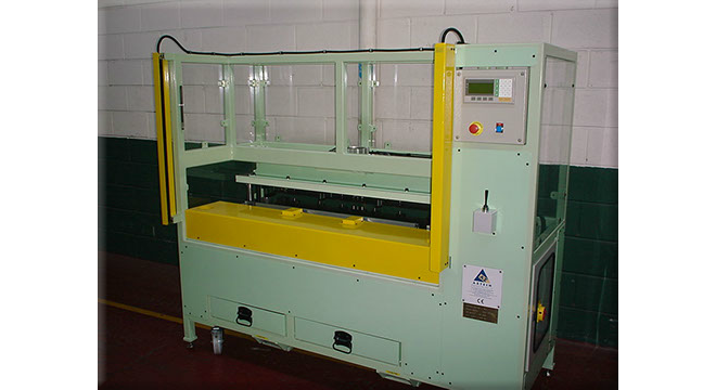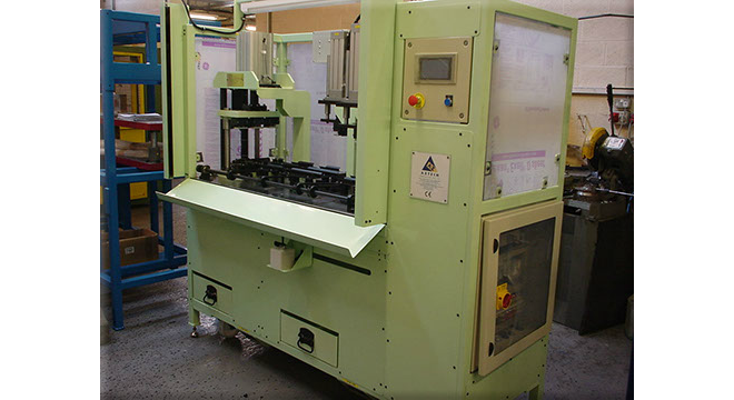 The machine is an electro/hydraulic that cut 10/15mm off the top end of the component. The cutting action is blade onto brass with the brass being situated on the top bolster of the die set and the cutting blade stroking upwards. It has three ejector pins per nest that are connected and activated by a single cylinder when the main ram cylinder has returned to the top of its stroke.