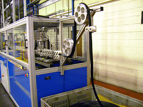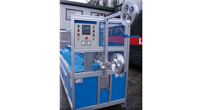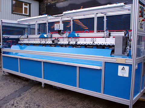 Design and manufacture a self-contained machine that cut from a coil extrusion to a finished size, ‘zap’ the warp in four areas of the seal, drill two drain holes and auto-mark the extrusion as having passed though the machine. The cycle time to be 43.5sec’s max.
