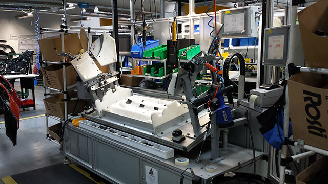 Assembly begin with loading a toproll & the lever/lamp moulding“A” surface down into the rig. Following colour check, the main carpet is then fitted. As the main moulding is carpet & the toproll PP, it is possible that a single colour sensor may not be suitable & therefore two are included in this quote.