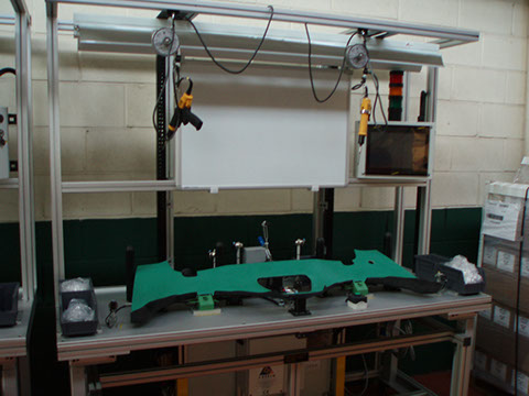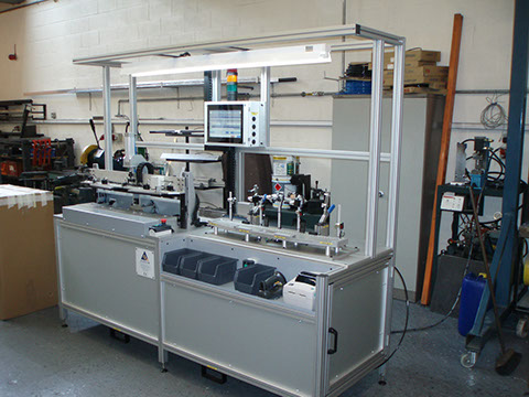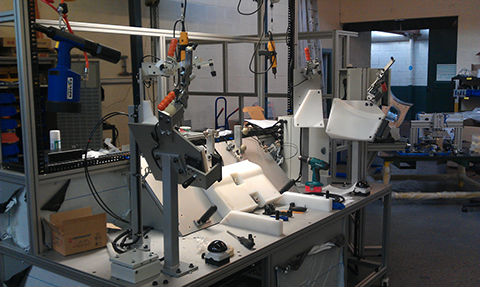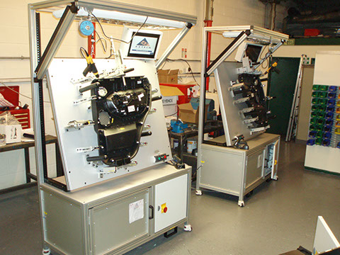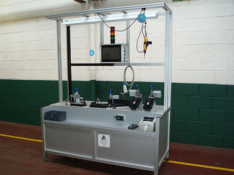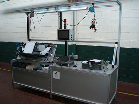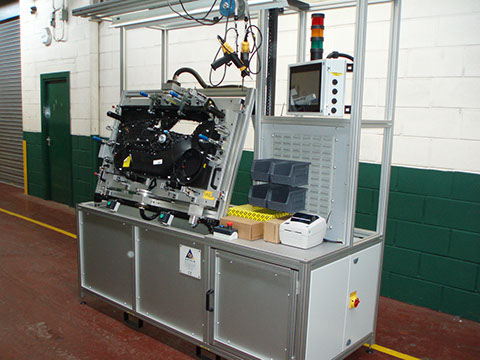 A single piece of equipment that process a left or right hand armrest and /or left or right hand switch plinth at any one time. Also on the bench in the centre is the barcode scanner and label printer. An EBL screwdriver is suspended from the overhead rail via a carriage and spring balance allowing it to be used at any of the four positions. An HMI is positioned at head height in the centre of the bench and the control cabinet is housed under the worktop inside the frame.