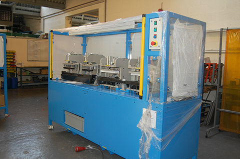 The machine is an Electro-pneumatic powered saw machine that cut front and rear seals to finished length. Incorporated into one end cut is a shaped blade to produce a notch on the front parts. This unit is powered by an air over oil intensifier.