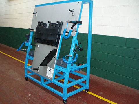 Machine that assist an operator positively locate and hold nine clip housings and two pads whilst the hot melt glue has set. The fixture also have a Poke Yoke feature checking that all clips have been detected.