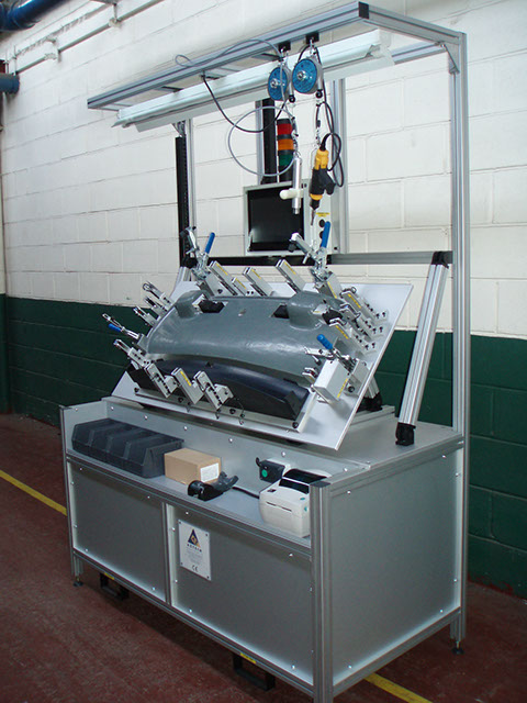 Machine that assist an operator positively locate and hold nine clip housings and two pads whilst the hot melt glue has set. The fixture also have a Poke Yoke feature checking that all clips have been detected.